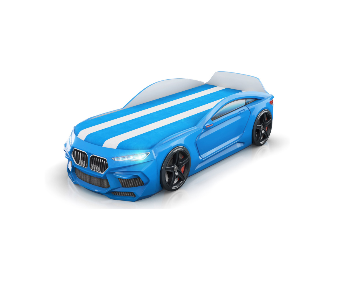 Кровать машина 2+ Голубой 170x70 с ящиком и матрасом подсветка фар