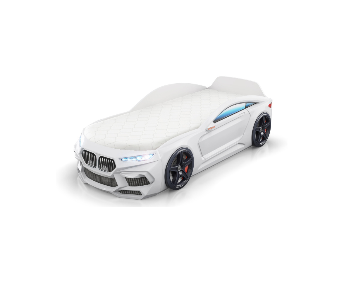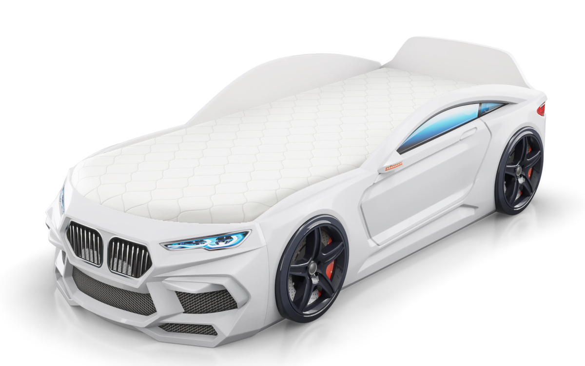 Кровать машина 1+ Белый 170x70 без ящика с матрасом подсветка фар