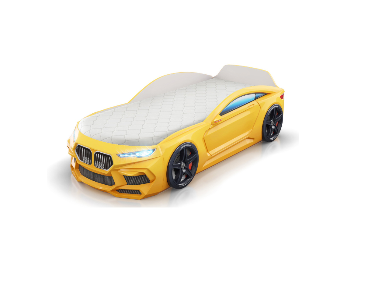 Кровать машина 2+ Желтый 170x70 с ящиком и матрасом подсветка фар